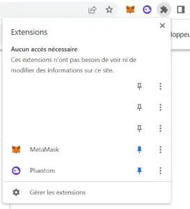 Pour que l’extension soit directement accessible depuis la barre de recherche, vous pouvez cliquer tout en haut à droite sur la pièce de puzzle puis sur l’épingle Phantom.
