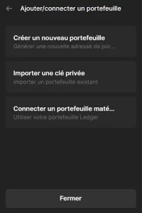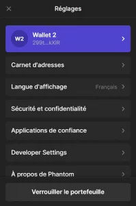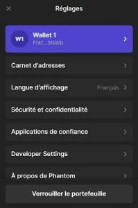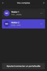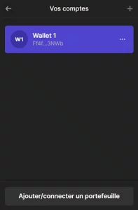 Pour cela, il suffit de cliquer sur l’icône “W1” tout en haut à gauche. C’est de là que vous accédez à vos paramètres. Puis, il suffit de cliquer sur “Wallet 1”, de sélectionner les trois petits points et d’“Ajouter/connecter un portefeuille ».