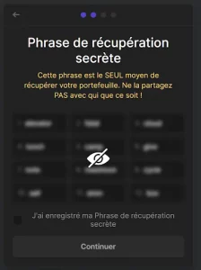 Si vous perdez ou cassez votre PC ou votre téléphone, vous pourrez récupérer votre portefeuille avec cette phrase. Ne la communiquez jamais à quelqu’un car il pourrait accéder à votre portefeuille pour y dérober vos cryptomonnaies et vos NFTs.