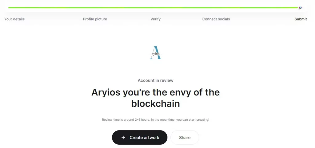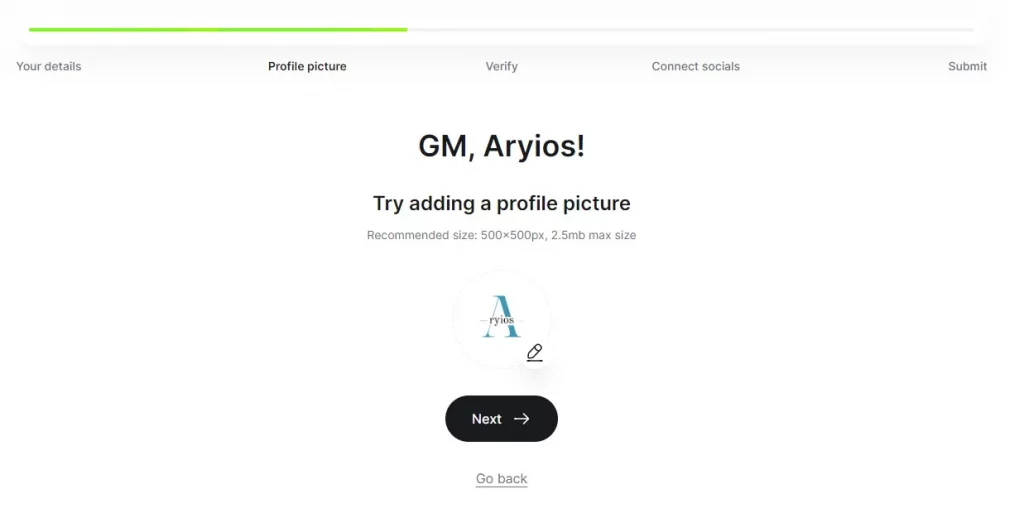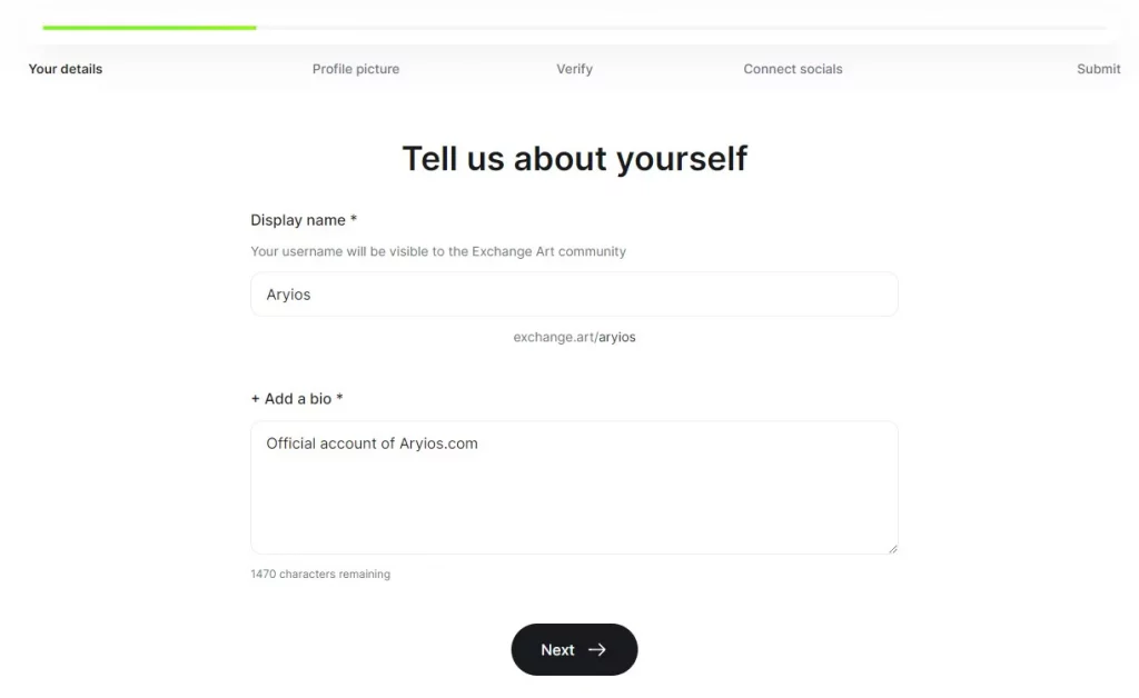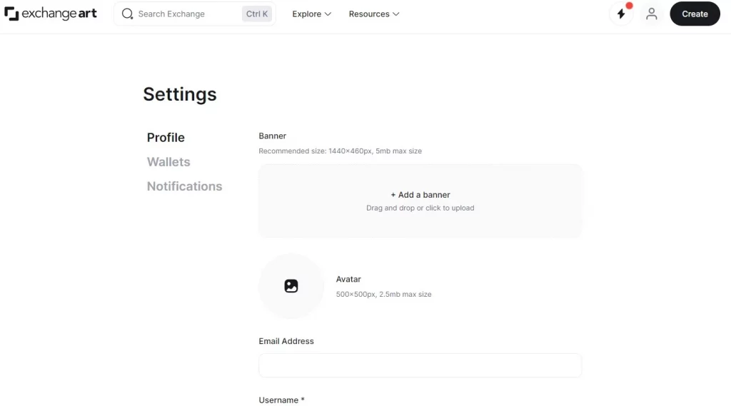 Une fois approuvée, vous pourrez accéder à votre profil exchange.art. Vous pouvez maintenant personnaliser votre « username » soit votre pseudonyme. Ajoutez également une image de profil et une bannière. Liez vos réseaux sociaux et votre site internet, si vous en possédez un (ce n’est pas une obligation).