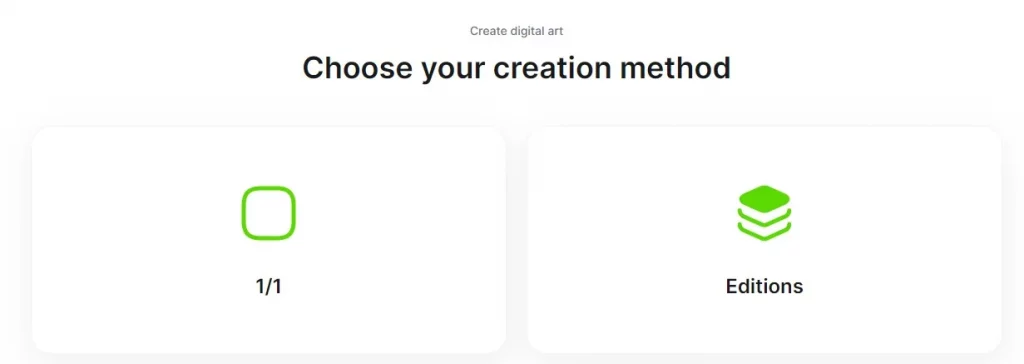 Votre compte va être passé en revu par exchange.art. Vous pouvez commencer à créer. « 1/1 » permet de mettre en vente un NFT en tant qu’œuvre unique. « Editions » permet de vendre plusieurs NFTs d’une même oeuvre. En général, les prix de vente sont beaucoup plus faibles du fait que votre NFT sera par conséquent moins rare.