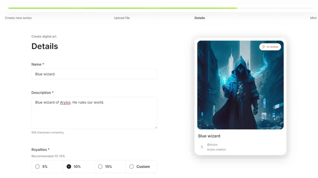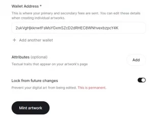 Il vous sera ensuite demandé d’ajouter une première oeuvre à votre nouvelle série. Vous devez donner un nom à votre oeuvre, une description, choisir les royalties que vous souhaitez toucher sur chaque revente (attention, des royalties trop hautes pourront dissuader des investisseurs d’acheter votre oeuvre car ils seront trop « taxés » sur une potentielle revente). Choisissez un portefeuille dans lequel vous souhaitez recevoir ces royalties. Nous vous conseillons d’utiliser un portefeuille dédié aux royalties.