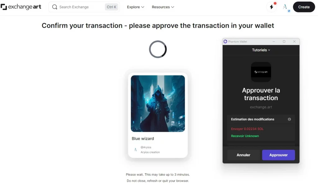 Comme indiqué dans l’introduction, nous allons utiliser le site exchange.art afin de vous montrer comment vendre ses propres NFTs sur Solana. Vous aurez besoin d’avoir un portefeuille Solana ainsi qu’un minimum de SOL afin de pouvoir payer les très faibles frais de transactions. 0,1 SOL devrait suffir pour mettre en ventes quelques NFTs.