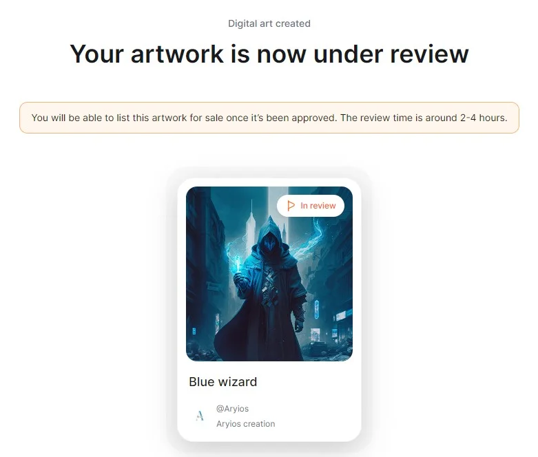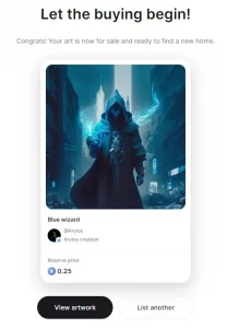 Une fois votre collection approuvée, vous pourrez décider de mettre en vente votre NFT à un prix fixe ou sous forme d’enchère. Attention, Exchange.art peut vous demander de prouver que vous êtes bien l’artiste derrière l’art revendiqué. Vous devez être en mesure de prouver cela. Ils vous contacteront par mail si besoin.