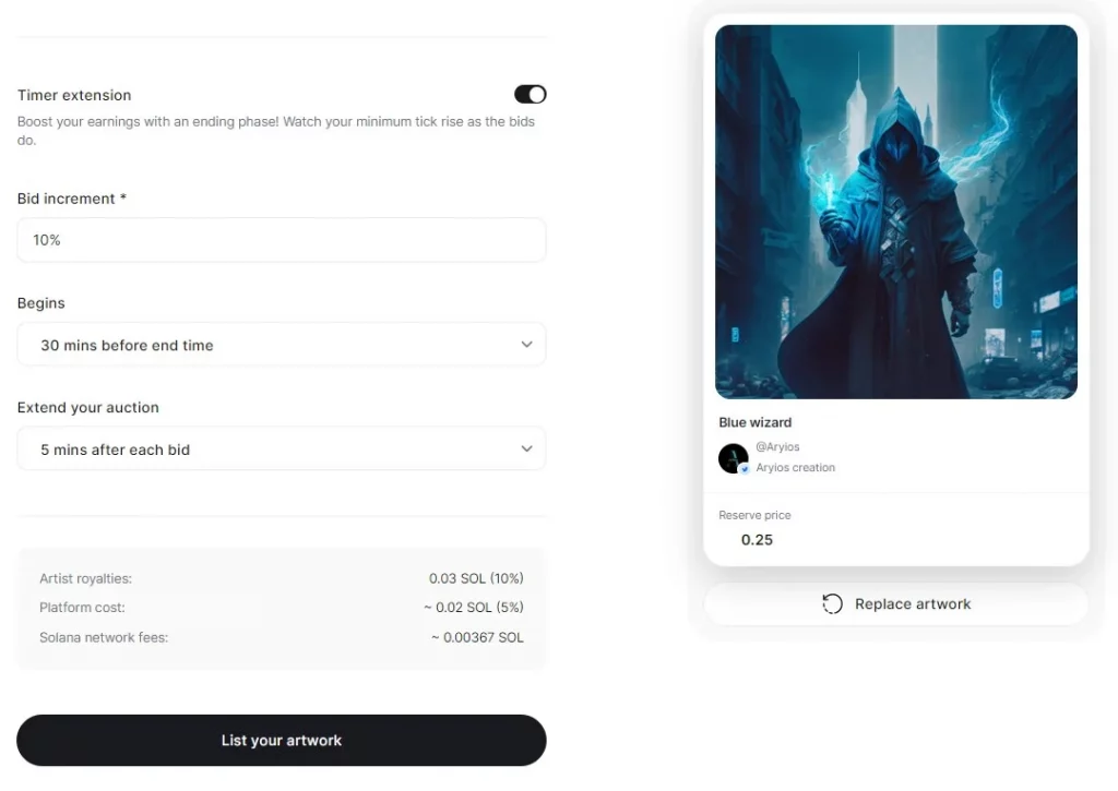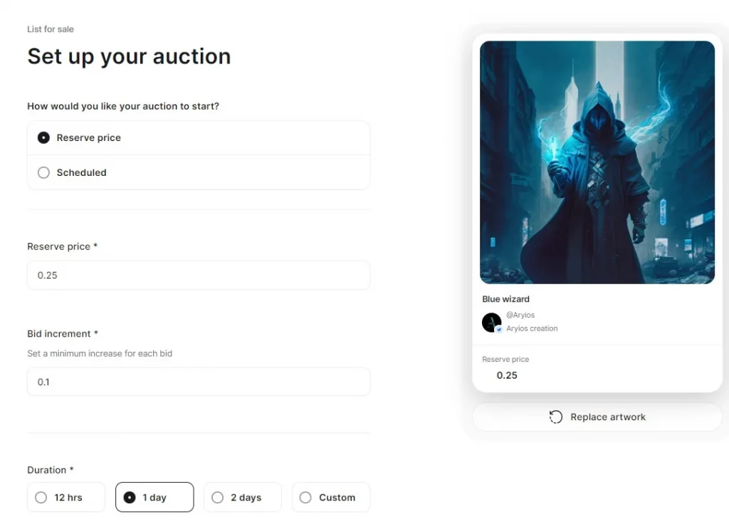 Après avoir sélectionné le NFT que vous souhaitez vendre sous forme d’enchère, vous aurez la possibilité de choisir toutes les caractéristiques de votre enchère. Le temps, le prix de réserve (prix minimal de vente), une potentielle extension de durée d’enchère…